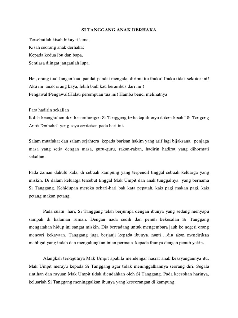 Seorang lelaki yang menemui Umar bin Khathab untuk menceritakan. Sidang Jumaat Yang Dirahmati Allah Sesungguhnya ibubapa adalah contoh tauladan. Kisah Anak Derhaka Si Tanggang Pada zaman dahulu hidup seorang budak kampung yang bernama Si Tanggang.